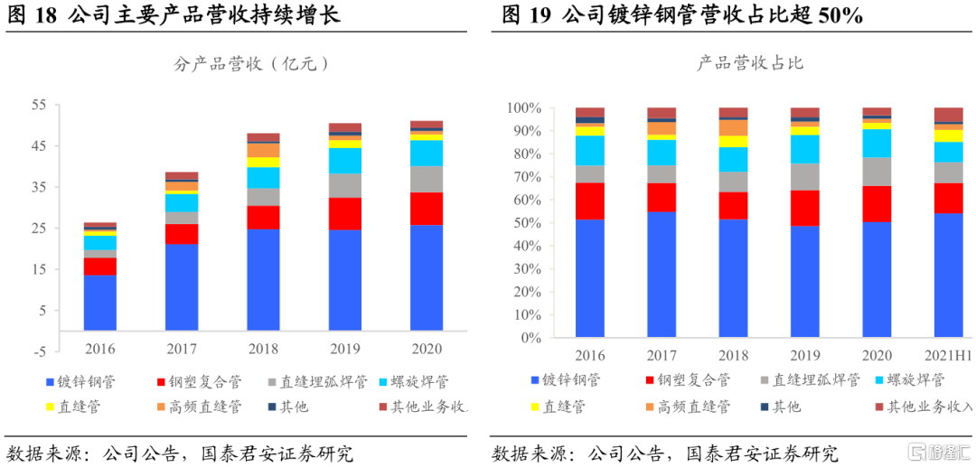 熱鍍鋅鋼管是公司主要產品,營收占比超50%。鍍鋅鋼管多用作輸水管和煤氣管,公司生產的鍍鋅鋼管全部為熱鍍鋅鋼管,2016-2021H1公司熱鍍鋅鋼管營收占比分別為55.87%、54.70%、51.42%、48.59%、50.36%、54.11%。公司產品還包括鋼塑復合管、螺旋焊管、直縫埋弧焊管等,2021H1公司鍍鋅管、鋼塑復合管、螺旋焊管、直縫埋弧焊管營收分別為25.73、8.02、6.32、6.30億元,營收占比分別為54.11%、13.22%、9.06%、8.78%。