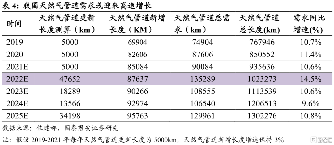 穩增長背景下,鋼管需求或將快速增長。2021年中央經濟工作會議強調加快城市老化管道的更新改造,且住建部等三部委發布的《關于進一步明確城鎮老舊小區改造工作要求的通知》明確將老舊管線作為老舊小區改造的優先項目,我們預期城市老化管道將集中更新改造。假設服役20年以上的燃氣管道需要更換,測算2022年我國燃氣管道總需求同比21年將上升50%左右。