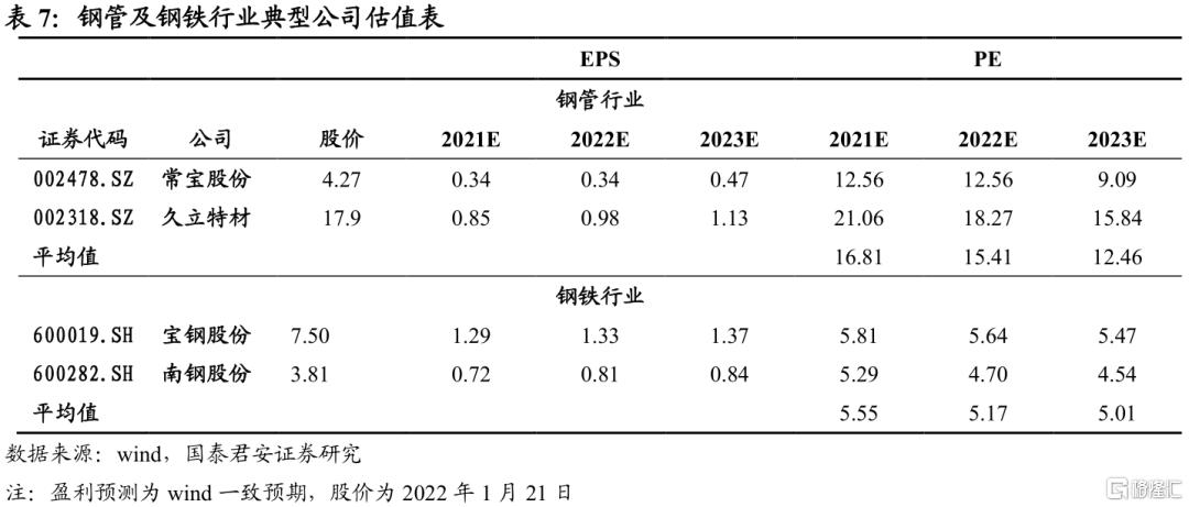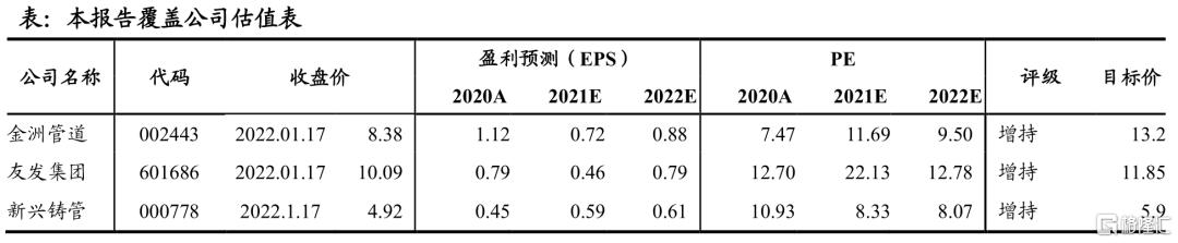 鋼管行業為加工行業,行業集中度較低,但下游需求分散度也較高,行業內公司已形成錯位競爭格局。按照wind一致預期,鋼管行業公司常寶股份、久立特材2022年PE均值為16.26倍??紤]到久立特材、常寶股份產品以不銹鋼鋼管為主,而友發集團、金洲管道鋼管產品多為碳鋼鋼管,產品盈利能力相對較弱,我們給予兩家公司2022年PE 15倍進行估值。新興鑄管業務包含鋼材和鑄管兩個板塊,兩個板塊營收占比大致相等。按照wind一致預期,鋼鐵行業典型公司寶鋼股份、南鋼股份2022年平均PE為5.17倍,結合鋼鐵、鋼管行業估值水平,新興鑄管2022年PE在10倍左右。我們維持新興鑄管目標價5.9元,對應2022年PE為9.67倍。