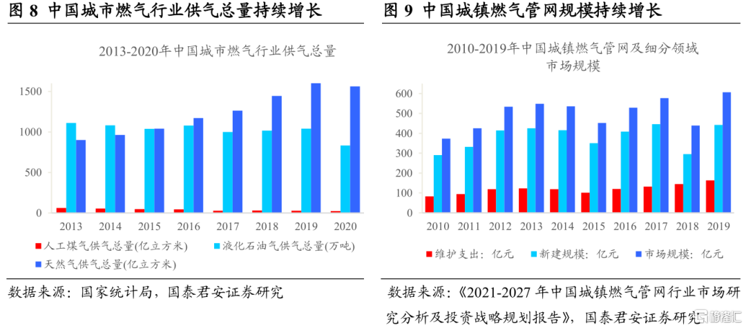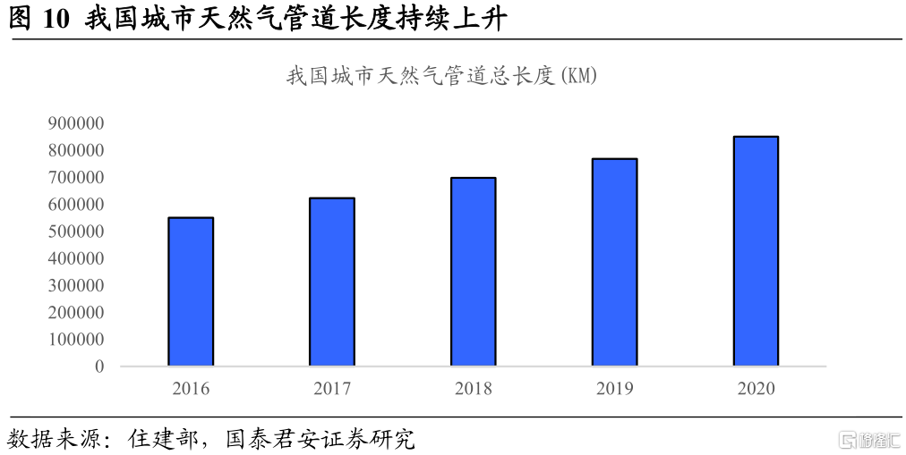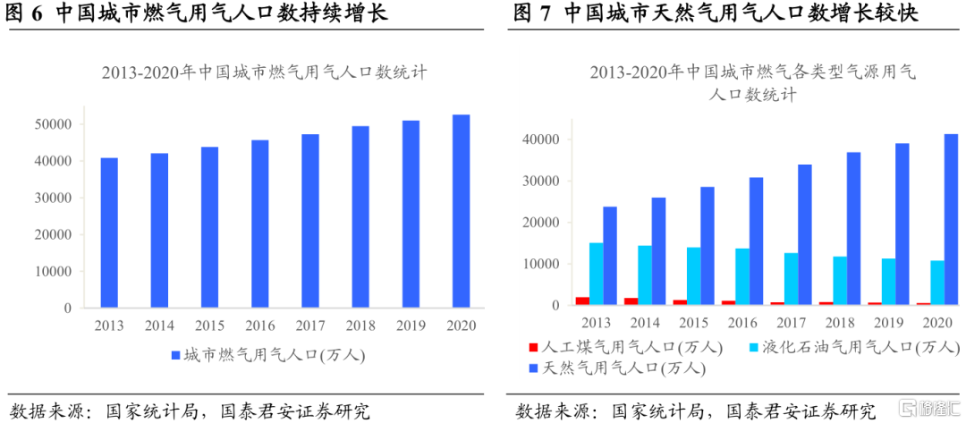 城鎮化、“煤改氣”助力居民燃氣市場穩步增長。我國居民消費能源主要為燃煤、電力和燃氣,其中燃氣又分為煤氣、液化氣和天然氣,液化氣主要通過液化氣罐運輸,天然氣主要通過管道運輸,是城市燃氣管網的主要需求來源。根據國家統計局數據, 2020年我國城市燃氣用氣人口數為5.26億,較2019年增加1620萬。其中天然氣用氣人口穩步增長,而液化氣、煤氣用氣人口逐步下降:2020年城市煤氣、液化氣、天然氣用氣人口分別為548.2萬、1.08億、4.13億,分別較2019年下降127.17萬、下降529.63萬、增長2277萬。當前以燃煤為主要能源的中小城鎮替代的空間仍然較大,中小城鎮“煤改氣”的推進將帶動天然氣市場規模穩步上升,而我國城鎮化仍將持續推進,我國居民燃氣市場規模仍將不斷上升。