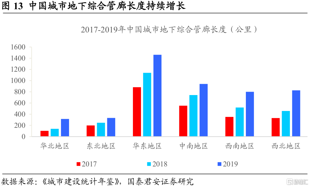 十四五期間我國地下管廊建設仍將加速推進。我國城市正在往精細化方向發展,為滿足我國城市化建設的需求,我國城市地下空間資源的利用將更加集約,城市地下各種類的市政管網設施將逐漸轉變為集中化、統一化的城市地下管道綜合走廊。我國《全國城市市政基礎設施建設“十三五規劃”》計劃“十三五”期間建設地下管廊8000公里以上,而2016-2019年我國地下管廊建設長度僅為4200.18千米,我們預期“十四五”期間我國地下管廊長度或將加速推進。