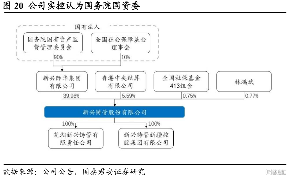 新興鑄管為全球規模最大的球墨鑄管生產企業,也是我國最大的鋼格板生產基地。公司主營業務為鑄管和鋼鐵冶煉和壓延加工等,公司目前鑄管產能300萬噸,管件產能3萬噸,鋼格板產能10萬噸,鋼材產能500萬噸。公司控股股東為新興際華集團,持股占比39.96%,實際控制人為國務院國資委。