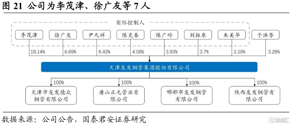 友發集團為國內鋼管龍頭企業,公司鋼管產能1300萬噸,產量連續14年位居國內第一,公司在國內焊接管(鋼管細分品類)市場占有率在19.37%左右。公司主要產品包含焊接圓管、鍍鋅圓管、方矩焊管等,產品廣泛用于供水、供氣、供熱等領域。公司控股股東及實控人為李茂津、徐廣友等7人組成的一致行動人,合計持股48.5%。