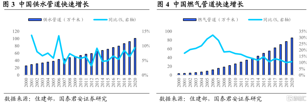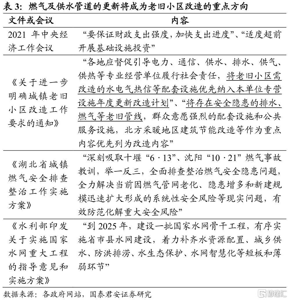 排水、燃氣管道更新成為城鎮老舊小區改造的工作重點。根據住建部等三部委2022年1月3日下發的《關于進一步明確城鎮老舊小區改造工作要求的通知》,城鎮老舊小區改造應“將老舊小區需改造的水電氣熱信等配套設施優先納入本單位專營設施年度更新改造計劃”,且“將存在安全隱患的排水、燃氣等老舊管線……作為重點內容優先列為改造內容”。我們認為文件進一步確認了老舊燃氣管道更新的迫切性,在此背景下,我們預期我國將迎來城市老化管道集中更新,燃氣、給排水管道需求有望超預期集中爆發。