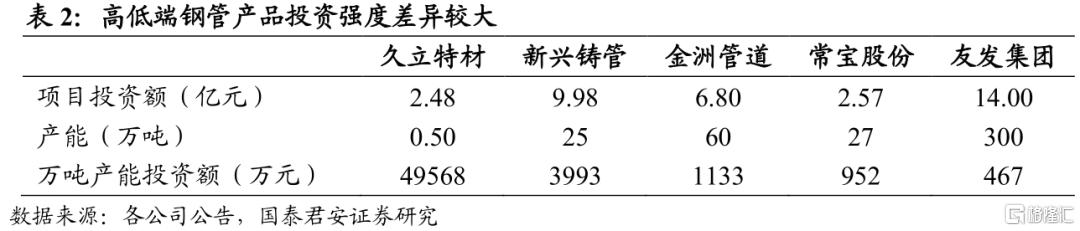 鋼管行業競爭格局較好。我們觀察到,雖然鋼管行業集中度較低,但行業內公司形成了錯位競爭的格局。在給排水球墨鑄管領域,新興鑄管一家獨大;在燃氣管道領域,友發集團與金洲管道為競爭關系,但金州管道高端產品占比更高;在不銹鋼管領域,常寶股份側重油管、套管,而久立特材側重石化管道、軍工核電用管道等。