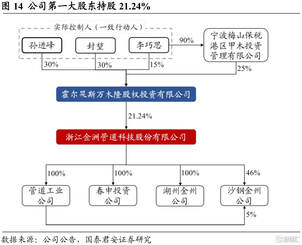 金洲管道前身系湖州金洲管業有限公司,2002年經浙江省人民政府企業上市工作領導小組批準,湖州金洲管業有限公司采取整體變更方式設立浙江金州管道科技股份有限公司。2010年7月6日公司于深交所上市,成為國內第一家以焊接鋼管為主業的A股上市公司。截至2021年9月底,公司第一大股東為霍爾果斯萬木隆股權投資有限公司,持股21.24%,公司實際控制人為孫進峰、封堃、李巧思三人組成的一致行動人。公司全資子公司包括浙江金洲管道工業有限公司、湖州金州石油天然氣管道有限公司等。