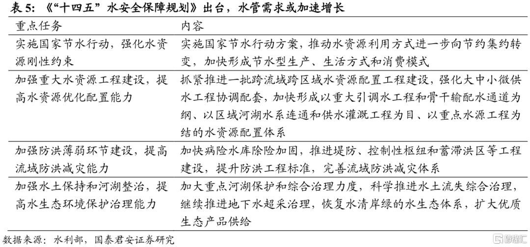 《“十四五”水安全保障規劃》出爐,水管需求或加速增長。2022年1月,發改委、水利部印發《“十四五”水安全保障規劃》(以下簡稱《規劃》),對“十四五”期間水安全保障提出了總體規劃,這也是國家層面首次編制實施的水安全保障五年規劃。規劃明確“加快構建國家水網,加強水生態環境保護,深化水利改革創新,提高水治理現代化水平”,我們預期“十四五”期間,我國水管需求或加速增長。