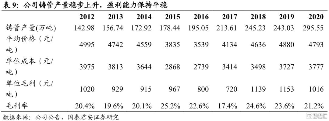 公司鑄管產量持續增長,盈利能力保持穩定。2012年到2020年,公司鑄管產量穩步上升,產量復合增長率9.5%。公司鑄管產品的毛利率保持在20%左右,盈利能力保持穩定。