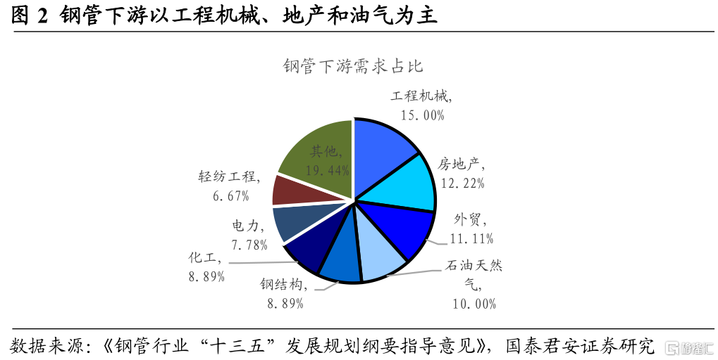 鋼管下游主要以工程機械和地產為主。根據《鋼管行業“十三五”發展規劃綱要指導意見》,工程機械、地產、出口和石油天然氣是我國鋼管下游的主要組成部分,占比分別為15%、12.22%、11.11%、10%。鋼管需求受到經濟周期的影響較大,行業整體呈現周期波動;細分行業如高端鋼管市場,下游需求相對平穩,波動性較小。