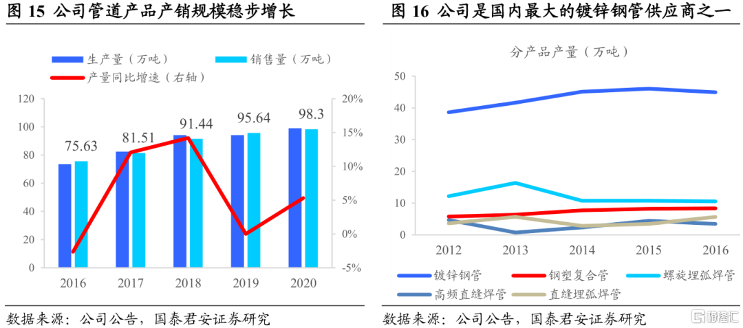 公司管道產品產銷規模持續增長。2016-2020年公司管道產銷量持續增加,產量復合增長率為7.74%、銷量復合增長率為6.77%。2020年公司管道總產量為99.06萬噸,同比增長5.3%;總銷量為98.3萬噸,同比增長2.78%。公司產品中鍍鋅鋼管產量最多,占比超50%,公司是國內最大的鍍鋅鋼管供應商之一。