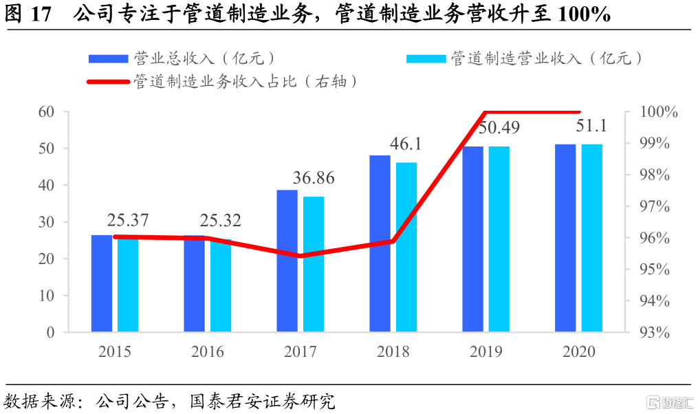 公司專注深耕管道制造主業。2016-2020年公司營業總收入、管道制造營業收入持續增長,復合增長率分別為17.97%、19.19%;2019年開始,公司專注于鋼管制造主業,其他業務完全剝離。2020年公司實現營業收入51.1億元,同比增長1.21%;2021前三季度公司實現營業收入50.56億元,同比增長45.90%。