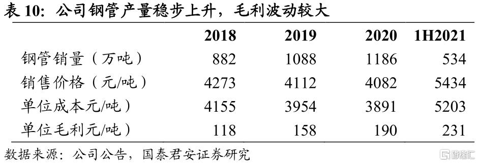 公司產能仍將繼續上升。2019年4月公司審議通過“新建年產3萬噸高品質薄壁不銹鋼管材管件項目”,項目投資預算3億元、建設周期3年,截至目前該項目進展已完成80%。2020年11月公司審議通過“投資建設年產60萬噸優質焊管和工廠預制深加工管材管件項目”,項目總投資6.8億元、建設周期3年。兩個項目建成后將進一步整合公司管道產業的資源布局,提升公司整體競爭力。